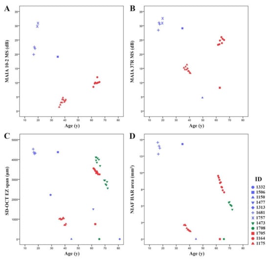 Scatterplots showing 10–2 (macular) and 37R (foveal) MAIA mean sensitivity (MS), spectral-domain optical coherence tomography (SD-OCT) ellipsoid zone (EZ) span and near-infrared autofluorescence (NIAF) hyperautofluorescent ring (HAR) area against age in all available patients, including serial measurement in some patients. Colours of markers indicate genotype groups including small deletion and deletion/insertion (Blue), splice site mutations (Green) and large deletions (Red). An overall decline of macular (A) and foveal (B) MS with increasing age was noted in the whole cohort. However, both methods showed short-term variations in individual patients. Both EZ span (C) and HAR area (D) showed age-dependent decline in those with available serial measurements. However, substantial variation was noted between patients and genotypes.
