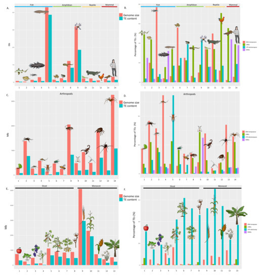 Genome size and its TE content across different organisms. (A) Genome size and its TE content in Gb across different vertebrates, from left to right: (1) Callorhinchus milii, (2) Tetraodon nigroviridis, (3) Danio rerio, (4) Latimeria chalumnae, (5) N. forsteri, (6) Xenopus tropicalis, (7) Nanorana parkeri, (8) Ichthyophis bannanicus, (9) Ambystoma mexicanum, (10) Anolis carolinensis, (11) Alligator mississipiensis, (12) Gallus gallus, (13) Ornithorhynchus anatinus, and (14) Homo sapiens. (B) Percentages of TEs types (DNA transposons, LINEs, LTR retrotransposons, and SINEs) of the vertebrates presented in (A). (C) Genome size and its TE content in Mb across different arthropods, from left to right: (1) Acromyrmex echinatior, (2) Aedes aegypti, (3) Anopheles gambiae, (4) Culex quinquefasciatus, (5) Drosophila melanogaster, (6) Lucilia cuprina, (7) Apis mellifera, (8) Blattella germanica, (9) Bombyx mori, (10) Centruroides exilicauda, (11) Eurytemora affinis, (12) Ixodes scapularis, (13) Latrodectus Hesperus and 14) Loxosceles reclusa. (D) Percentages of TEs types of the arthropods presented in (C). (E) Genome size and its TE content in Mb across different plants, from left to right: (1) Malus domestica (2) Fragaria vesca, (3) Vitus vinifera, (4) Arabidopsis thaliana, (5) Glycine max, (6) Solanum lycopersicum, (7) Solanum tuberosum, (8) Gossypium raimondii, (9) Hordeum vulgare (10) Zea mays, (11) Sorghum bicolor, (12) Oryza sativa and (13) Musa acuminate. (F) percentages of TEs types of the plants presented in (E). Data from [45,46,56,59,60,61,62,63,64].