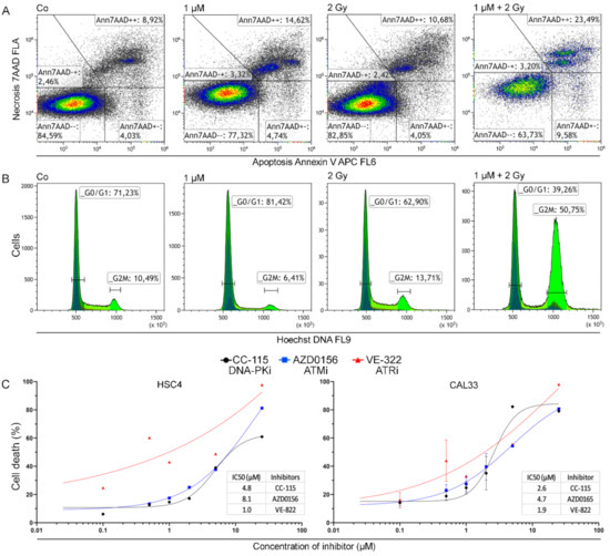 Cells were seeded into T25 flasks. The number of cells was calculated to reach a confluence of about 70%. After reaching adequate confluence, the medium was changed to a serum-reduced medium containing only 2% of FBS. Subsequently, the cells were treated with the kinase inhibitors. For the DNA-PK inhibitor CC 115 and the ATM inhibitor AZD0156, concentrations of 0, 0.5, 1 and 2 µM were used; for the ATR inhibitor VE 822 cells were treated with 0, 0.1 and 0.5 µM. After 3 h half of the flasks were irradiated with 2 Gy ionizing radiation (IR) by an ISOVOLT Titan X-ray generator (GE, Ahrensburg, Germany). After 48 h of treatment, the cells, including the supernatant, were harvested and stained with 10 µL of a mixture of equal parts APC Annexin V (BD Biosciences, Franklin Lakes, NJ, USA) and 7 AAD (BD Biosciences, Franklin Lakes, NJ, USA) and incubated on ice for 30 min. Subsequently the staining agent was removed, and the cells were centrifuged and resuspended in cold Ringer’s solution (Fresenius, Bad Homburg, Germany) in preparation for flow cytometry analysis. This was performed with the Cytoflex flow cytometer (Cytoflex, Beckman Coulter, Brea, CA, USA). For data evaluation, the Kaluza analysis software (Beckman Coulter, Brea, CA, USA) was used.