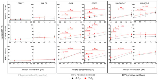 Flow cytometry analysis of cell death. Cells are grouped into normal donor cells (SBLF7, SBLF9), HPV-negative (HSC4, CAL33), and HPV-positive (UM SCC 47, UD SCC 2) HNSCC cell lines. Cell death was determined through flow cytometry by apoptosis (Annexin V) and necrosis (7AAD) detection. Irradiated samples are compared to non-irradiated samples. Effects of increasing concentrations of kinase inhibitors on each cell line are shown. For CC 115 and AZD0156 0.5, 1 and 2 µM, for VE 822 0.1 and 0.5 µM of the inhibitor were used. Each value represents mean ± SD (n ≥ 3). Significance was determined by two-tailed Mann Whitney U test * p ≤ 0.05 and ** p ≤ 0.01.