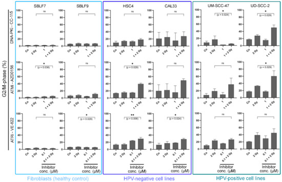 The following are available online at https://www.mdpi.com/article/10.3390/genes12060925/s1, Figure S1: Representative dot plots of AnnexinV/7AAD cell death staining of the healthy fibroblasts SBLF7 and SBLF9, Figure S2: Representative dot plots of AnnexinV/7AAD cell death staining of the HPV-positive HSC4 and Cal33, Figure S3: Representative dot plots of AnnexinV/7AAD cell death staining of the HPV-negative UM-SCC-47 and UD-SCC-2, Figure S4: Representative histograms of Hoechst (DNA) cell cycle staining of the healthy fibroblasts SBLF7 and SBLF9, Figure S5: Representative histograms of Hoechst (DNA) cell cycle staining of HPV-positive HSC4 and Cal33, Figure S6: Representative histograms of Hoechst (DNA) cell cycle staining of HPV-negative UM-SCC-47 and UD-SCC-2, Figure S7: Dose escalation study for the induction of apoptosis or necrosis (cell death) by the inhibitors CC 115, AZD0156 and VE 822 conducted on HPV-positive cell line UM-SCC-47, Figure S8: Colony forming assay. Representative images of all tested cell lines (healthy: SBLF7, SBLF9; HPV-neg: HSC4, Cal33; HPV-pos: UM-SCC-47, UD-SCC-2) and inhibitor (AZD0156: ATMi; CC-115: DNA-PKi, VE-822: ATRi), Figure S9: Representative images of wound healing assay of HPV-positive cell line UM-SCC-47 at time points 0 h and 48 h, Figure S10. Representative images of wound healing assay of HPV-negative cell line Cal33 at time points 0 h and 48 h, Figure S11; Representative images of wound healing assay of healthy control cell line SBLF7 at time points 0 h and 48 h.