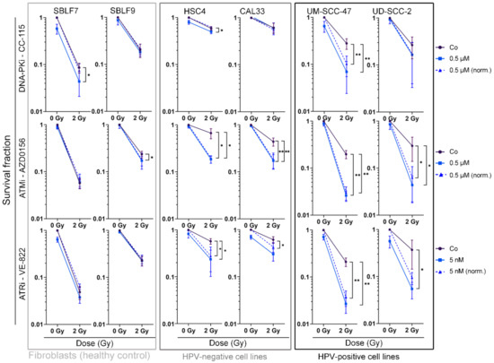 Colony forming assay of HNSCC cell lines and normal controls. Cells are shown grouped into normal cells (SBLF7, SBLF9) and HPV-negative (HSC4, CAL33), and HPV-positive (UM SCC 47, UD SCC 2) HNSCC cells. Graphs show cell survival at 0 Gy and 2 Gy, either with additional treatment of kinase inhibitors (0.5 µM CC 115, 0.5 µM AZD0156, 5 nM VE-822) or without. Additionally, cell survival under KI treatment was normalized to detect synergistic effects. Dashed line represents mean survival fraction normalized to the cytotoxicity induced by KI alone. Each value represents mean ± SD (n ≥ 3). Significance was determined by one-tailed Mann Whitney U test * p ≤ 0.05 and ** p ≤ 0.01. p = 0.004: UM SCC 47 + CC 115, UM SCC 47 + CC 115 norm., UM SCC 47 + AZD0156, and UM SCC 47 + AZD0156 norm.; UM SCC 47 + VE 822 and UM SCC 47 + VE 822 norm.; p = 0.008: CAL33 + AZD0156 and CAL33 + AZD0156 norm.; p = 0.028: CAL33 + VE 822 norm.; p = 0.016: SBLF9 + AZD0156; p = 0.018: UD SCC 2 + AZD0156 and UD SCC 2 + AZD0156 norm.; p = 0.028: UD SCC 2 + VE 822; p = 0.050: HSC4 + VE 822, HSC4 + VE 822 norm., SBLF7 + CC-115; p = 0.050: HSC4 + CC 115, HSC4 + AZD0156 and HSC4 + AZD0156 norm.