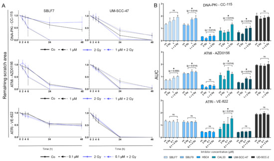 Comparing the cells treated with IR alone and the cells receiving combination therapy, it is evident that the addition of CC 115 reduced migration of SBLF9 (p = 0.014), HSC4 (p = 0.014), CAL33 (p = 0.014), and UM SCC 47 (p = 0.014) cells. Addition of AZD0156 decreased migration of SBLF7 (p = 0.050), SBLF9 (p = 0.014), CAL33 (p = 0.014), and UM SCC 47 (p = 0.014) cells. VE 822 only impaired cell migration of CAL33 cells (p = 0.014).