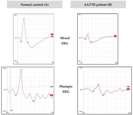 The main finding of this study was that the large majority of patients showed significant abnormalities of scotopic and photopic ERGs, including the PhNR, the negative potential following the b-wave, representing the activity of Retinal Ganglion Cells (RGCs) and their axons []. The ERG abnormalities, which were detected in all patients, may be related to a malfunction of TTR protein leading to a perturbation of visual cycle resulting in a reduced supply of retinoids, for both rod and cone photoreceptors. In this respect, it will be important in the future to explore the retinal function recovery after bleaching, as a process mediated by the visual cycle.
