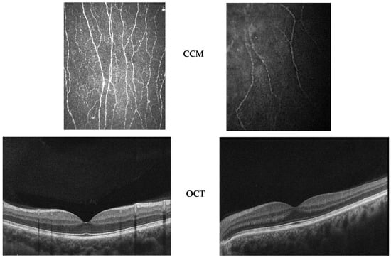All patients underwent a full ophthalmologic examination, including best corrected visual acuity (BCVA) using Early Treatment Diabetic Retinopathy Study (ETDRS) charts and intraocular pressure (IOP) measurements, as well as anterior segment slit lamp biomicroscopy and indirect fundus ophthalmoscopy. Color fundus photos were taken with Eidon (Centervue, Fremont, CA, USA), while corneal confocal microscopy (CCM) was obtained with Confoscan 4 (Nidek, Gamagori, Japan).