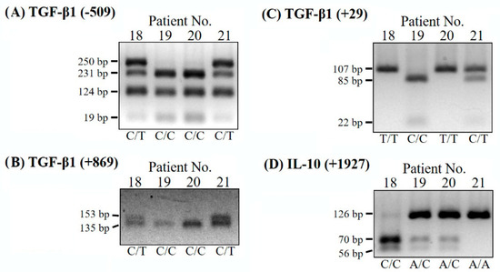 Representative electrophoresis gel images of the PCR-RFLP analysis of Taiwanese osteoporotic patients. The different single-nucleotide polymorphisms (SNPs) of (A) TGF-β1 (−509 C/T), (B) TGF-β1 (+869 T/C), (C) TGF-β1 (+29 T/C) and (D) IL-10 (+1927 A/C) are shown for patients No. 18 to No. 21.
