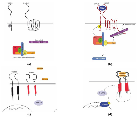 The TGF-beta superfamily includes more than 30 structurally related proteins that are morphogens similarly to Wnt. Several families are distinguished in this superfamily: TGF-beta itself, several BMP families, Lefty, Activin/Inhibin, Vg1, a number of Gdf, and others. All ligands from TGF-beta superfamily synthesized as a precursor protein. This precursor contains three domains—the N-terminal signal peptide, propeptide (or latency-associated peptide), and the C-terminal mature peptide. During processing, the mature peptide is cleaved by Furin, a convertase, at the RxxR conserved site [32]. The mature peptide forms a dimer, which binds to the specific TGF-beta receptor (Figure 1c,d; [33]). The TGF-beta receptor is a single-pass membrane protein containing a cytoplasmic kinase domain with both serine/threonine kinase activity and tyrosine kinase activity [34]. There are two types of the TGF-beta receptors—Type II receptor, constitutively active, and Type I receptor. When the dimeric ligand binds, a complex is formed of two Type I receptor molecules and two Type II receptor molecules. Constitutively active Type II receptor then phosphorylates a TGF-b Type I receptor. Phosphorylated Type I receptors phosphorylate and thereby activate receptor-associated SMAD proteins (R-SMADs), including SMAD1/5 and SMAD2/3 [35,36]. R-SMAD proteins are composed of two main functional domains: the Mad-homology domains 1 and 2 (MH1 and MH2). Activated R-SMADs interact with the common-mediator SMAD (Co-SMAD, SMAD4) and become translocated to the nucleus. This SMAD protein complex then regulates the expression of TGF-beta target genes by interacting with transcription factors. Inhibitory SMADs (I-SMADs, SMAD-6) are able to compete with Co-SMADs in interaction with R-SMADs, thus inhibiting the signaling pathway.