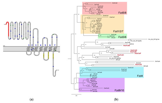 All six H. dujardinii Frizzled have a secondary structure typical for this receptor: an extracellular CRD domain, seven transmembrane domains, conservatively located cysteines in loops between transmembrane domains, and motifs in intracellular regions responsible for interaction with Dishevelled (Figure 2a).