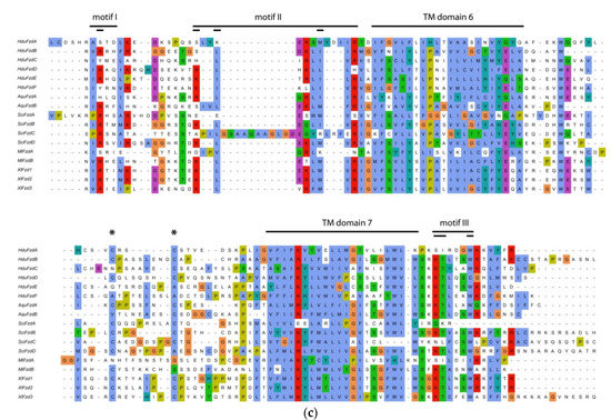 Frizzled contains three motifs for interaction with the PZD domain of the Dishevelled protein. ICL3 of Frizzled contains two of these motifs—motif 1 (IRxV) and motif 2 (KLEKLMVR, Figure 2a,c). Most of the invariant amino acids in these motifs occupy positions in the alignments that are conservative with respect to vertebrates. There are two conserved cysteine residues between TM domains 6 and 7; the first of them is replaced with non-similar amino acid residue only in HduFzdC and HduFzdE (Figure 2c). The same substitution is observed in FzdA of the ctenophore M. leidyi [23]. The third motif (KTxxxW) is located in the free cytoplasmic C-end of Frizzled. Here invariant amino acid residues are substituted in HduFzdA, as well as in MleFzdA and SciFzdA. This Frizzled-specific motif has been shown to directly interact with the PDZ domain of Dishevelled [24]. Thus, in H. dujardinii, the majority of Frizzled proteins demonstrate conservatism at the level of functionally essential protein sequences ensuring signal transduction into the cytoplasm. HduFzdA seems to be an exception, as it contains several non-analogous substitutions in the motifs.