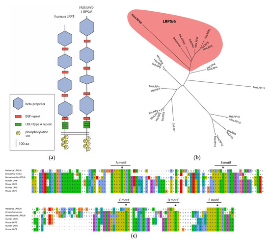 LRP5/6 protein in Halisarca dujardinii. (a) Comparison of domain organization in the human LRP5 and H. dujardinii LRP5/6 ortholog demonstrates conservative domain set and arrangement. (b) Unrooted ML tree indicates the phylogenetic position of HduLRP5/6 close to bilaterian orthologs. (c) Alignment of the C-end of HduLRP5/6 with Drosophila melanogaster, Nematostella vectensis, and mammalian orthologs demonstrates five conserved motifs targeted for phosphorylation. Sites recognizable by GSK3b are indicated by asterisks (*).