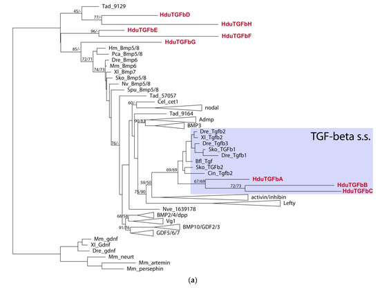 HduTGFbA, HduTGFbB, and HduTGFbC have eight cysteine residues, conserved in gene families of the TGF-beta-related clade (Figure 4b). HduTGFbG, HduTGFbE, and HduTGFbF have seven conserved cysteine residues, while HduTGFbD has only six, and HduTGFbH missed first, second, and fifth cysteine residues and have only five of them. Interestingly, when we ran an analysis on a full TGF-beta precursor with both the propeptide and the peptide domain, only HduTGFbA fell into the TGF-beta s.s. clade and the rest of the ligand groups at the base of the TGF-beta tree.