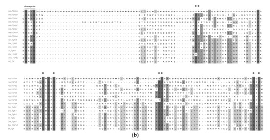 There are two Type II receptors (HduTGFbRIIa and HduTGFbRIIb) and four Type I receptors (HduTGFbRIa–HduTGFbRId). All contain the extracellular receptor domain, single-pass transmembrane domain, and intracellular kinase domain. Additionally, all H. dujardinii Type I receptors possess the glycine–serine repeat (GS region) adjacent to the kinase domain, an arrangement that is characteristic of metazoan Type I receptors. Phylogenetic analyses included sequences of TGF-beta receptors from representative metazoans and showed that H. dujardinii receptors are not supported in individual receptor subclasses (Figure 5a). Instead, HduTGFbRIIa appears sister to all other Type II receptors and HduTGFbRId as a sister to all Type I subclasses. HduTGFbRIc together with A. queenslandica sequence form a weakly supported group with activating receptors Type I (sax/Actr1/alk2). HduTGFbRIa and HduTGFbRIb occupy the base of the Type I receptors subtree together with A. queenslandica and M. leidyi sequences. HduTGFbRIIb forms a well-supported clade with two A. queenslandica sequences, lancelet, human, sea urchin, and sea squirt Type II receptors.