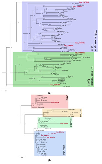 We were also able to detect six SMAD proteins (Figure 5b). There are five receptor SMADs, one belonging to the SMAD2/3 family (HduSMAD2), and four SMADs forming a sister group to the SMAD1/5/8 clade (HduSMAD1a–HduSMAD1d). There is also a single Co-Smad (HduSMAD4). No inhibitory SMAD belonging to SMAD6 was observed. All SMADs have the predicted MH1 and MH2 domains, characteristic of SMAD proteins.