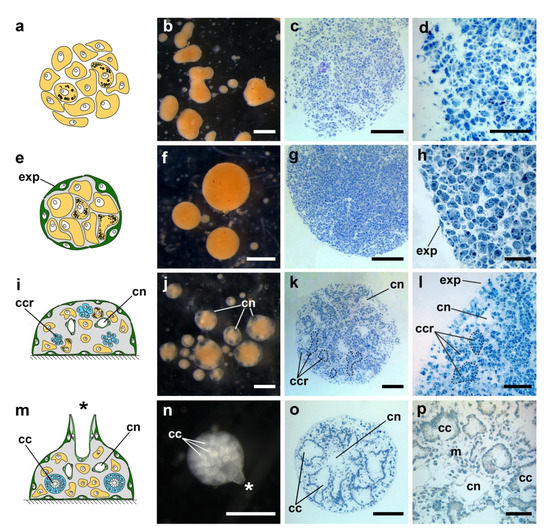 Key stages of the cell reaggregation and primmorph development in Halisarca dujardinii. (a–d) Primary multicellular aggregates; (e–h) True primmorphs, exp—exopinacoderm; (i–l) Progressed developing primmorphs, ccr—choanocyte chamber rudiments (marked by black dashed lines), cn—canals of aquiferous system, exp—exopinacoderm; (m–p) Reconstructed functional sponge, cc—choanocyte chambers, cn—canals of aquiferous system, m—mesohyl, osculum is marked by an asterisk; (a,e,i,m) Schematic representation of the developmental stages; (b,f,j,n) Developmental stages in vivo, stereomicroscopy, reflected light; (c,g,k,o) General histological structure, light microscopy, 1 µm thick sections; (d,h,l,p) Details of histological structure, light microscopy, 1 µm thick sections. Scale bars: (b,e,h,k) 500 µm; (c,f,i,l) 100 µm; (d,l,p) 50 µm; (h) 20 µm.