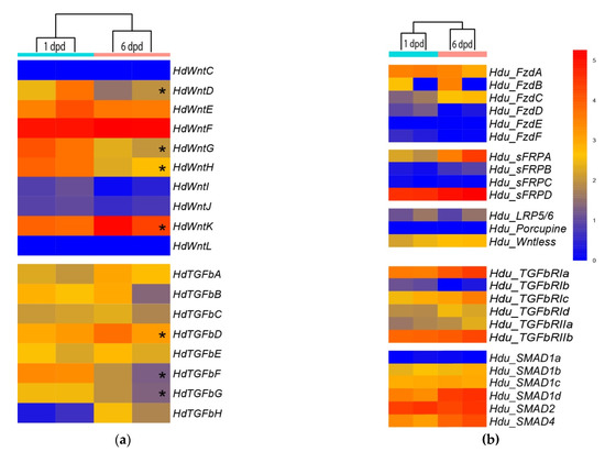 The following are available online at https://www.mdpi.com/article/10.3390/genes12060944/s1, Supplementary File S1: Alignment of Frizzled proteins in FASTA format, Supplementary File S2: Alignment of LRP proteins in FASTA format, Supplementary File S3: Alignment of TGF-beta proteins in FASTA format, Supplementary File S4: Alignment of TGF-beta receptors in FASTA format, Supplementary File S5: Alignment of SMAD proteins in FASTA format, Supplementary File S6: List of sequences’ accession numbers used in analyses. File S7: Predicted 3D and domain structure of HduLRP5/6.Supplementary File S8: Additional samples for WMISH experiments.