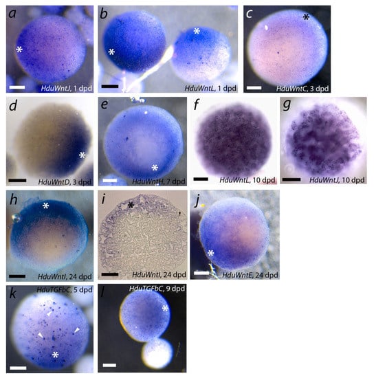 For HduWntH and HduWntI, expression was studied only at later stages of cell reaggregation: in PDPs 7 dpd and 24 dpd. For both genes at both studied stages, an asymmetric expression with a maximum at one pole of the aggregate was shown (Figure 8e,h,i).