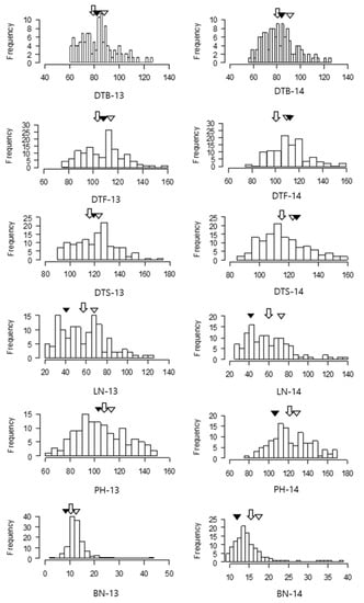 Frequency distribution for each trait in the F5 RIL population. The suffix “-13” refers to the spring trial conducted in 2013, while “-14” refers to the spring trial in 2014. Means for the parental and F5 RIL population are shown by arrows. (▽) Lactuca sativa L. cv. Chimasanchu (n = 10); (▼) Lactuca sativa L. cv. Banchu Red Fire (n = 10); (