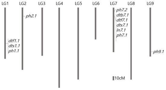 Of the phenotypic variation in 2013 and 2014, respectively. The presence of CS alleles in ln7.1 increased the leaf number. Analysis of plant height at the time of seed setting revealed five significant QTLs. Four QTLs (ph1.1, ph2.1, ph7.1, and ph9.1) were detected in 2013, and one QTL (ph7.2) was detected only in 2014. Two PH QTLs on LGs 1 and 2 were contributed by the RF alleles. ph7.1 was detected in the same region as other QTLs on LG 7 (dtb7.1, dtf7.1, dts7.1, and ln7.1), with the largest contribution to the phenotypic variation (37%). The presence of CS alleles in the QTLs increased plant height for the two PH QTLs (ph7.1 and ph9.1).