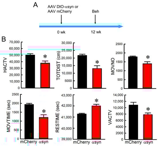 Administration AAV-DIO-αSyn to nigra induced bradykinesia in DAT-Cre rats. (A) Timeline of experiment. Animals receiving AAV-DIO-αSyn or AAV-mChery were placed in infrared locomotor activity chambers for 12 h (7 p.m. to 7 a.m.) during the dark cycle. (B) Intranigral administration of AAV-DIO-αSyn significantly reduced HACTV, TOTDIST, MOVNO, MOVTIME, and VACTV, while increased RESTIME. * Significant difference determined by t-test.