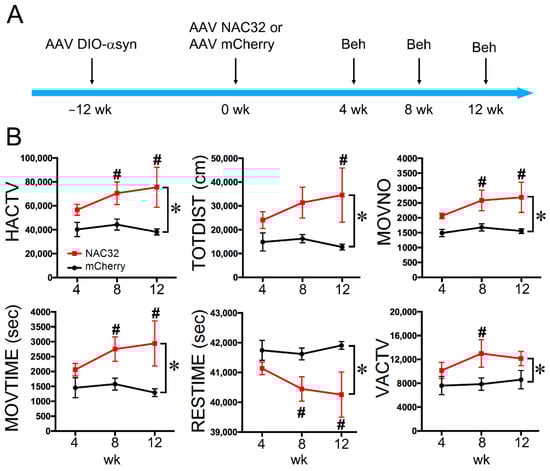 Intranigral administration of AAV-NAC32 normalized locomotor behavior in animals overexpressing αSyn. (A) Timeline of experiment. AAV-NAC32 or AAV-mCherry was injected into the SNcd of DAT-Cre rats at time 0. (B) Behavioral tests were conducted at 4, 8, and 12 weeks after the viral injection. Animals receiving AAV-NAC32 had a significant improvement in locomotor activity. The significant difference was determined by * two-way ANOVA and # post-hoc NK test.