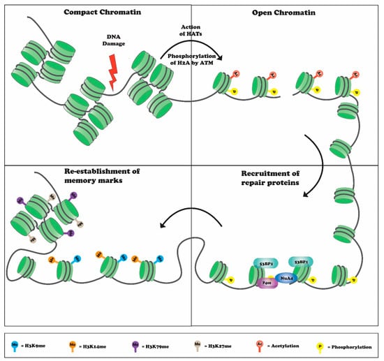 DNA damage initiates chromatin decompaction mediated by various histone acetyltransferases (HATs) and recruits various DSB-repair and chromatin-modifying proteins. Binding of these proteins, such as 53BP1, NuA4, and P400, leads to DSB repair followed by chromatin compaction, which helps in maintaining genome integrity.