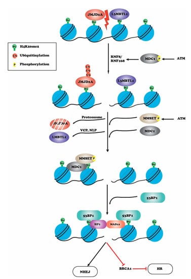 Upon DNA damage, L3MBTL1 and JMJD2A are released from H4K20me2 through ATM-mediated recruitment of MDC1 and phosphorylation of MDC1 at Ser 139. This leads to accumulation of RNF8 and RNF168 at DSBs, which causes ubiquitinoylation and degradation of JMJD2A by proteosome-mediated degradation and removal of L3MBTL1 by ATPase valosin-containing protein (VCP) and nuclear protein localizing cofactor protein 4 (NPL4). Thus, upon DNA damage, exposed H4K20me2 becomes available for 53BP1 binding to initiate NHEJ. 53BP1 recruits downstream effector proteins RIF1 and MAD12, which inhibit BRCA1 protein-binding to promote NHEJ over HR in the G1 phase of the cell cycle.