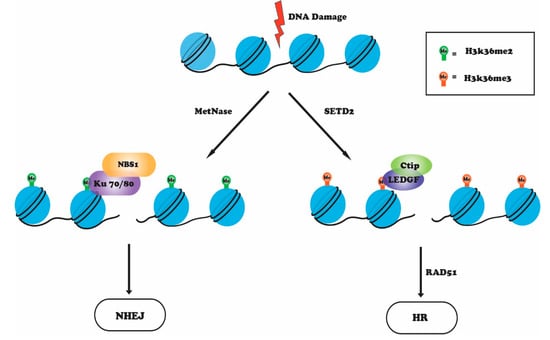 Upon DNA damage, metnase catalyzes H3K36me2, which recruits Ku70-NBS1 complex, to repair DNA damage via NHEJ pathway, whereas H3K36me3 catalyzed by SETD2 favors the HR pathway by recruiting LEDGF-CtIP complex. This is followed by RAD51 recruitment and, in turn, HR repair.
