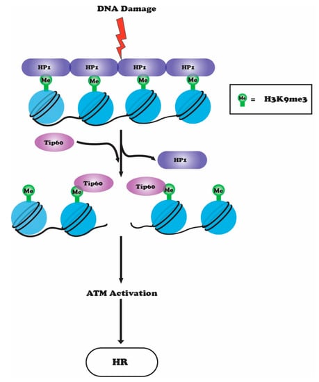 In response to DNA damage, HP1 is displaced from the H3K9me3 site allowing TIP60 to interact with H3K9me3 via its chromodomain. The interaction of TIP60 with H3K9me3 stimulates its HAT activity, which leads to acetylation of ATM and subsequent activation of its kinase activity, downstream ATM signaling, and HR-mediated repair.
