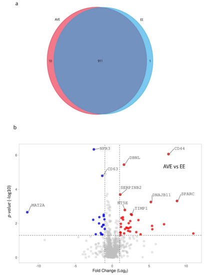 Venn diagram represents (a) the distribution of all detected proteins in aortic valvular endothelium (AVE) and endocardial endothelium (EE). The volcano plot represents (b) differentially expressed proteins in AVE cells compared to EE cells. The Student’s t-test was used for the differential expression analysis using Progenesis QI for Proteomics. Proteins with a raw p-value < 0.05 and fold change > 2 were highlighted in the figure (Red—upregulation and Blue—down-regulation).