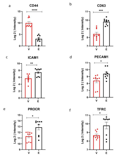 Cell surface markers identified in aortic valvular (AVE)and endocardial endothelium (EE). The GSEA analysis was used to determine the cell differentiation (CD) markers. The CD-marker highly expressed in AVE cells was represented in (a). The CD-markers highly expressed in EE cells were shown in (b–f). Cell The normalized peptide intensities from label-free proteomics data were used to create the graphs. The Student’s t-test was used for the differential expression analysis using Progenesis QI for Proteomics. A protein with a raw p-value < 0.05 and fold change > 1.5 was considered significant. V—Valvular endothelial cells; E—Endocardial endothelial cells. * p-value < 0.05, ** p-value < 0.01, *** p-value < 0.001 and **** p-value < 0.0001.