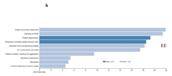 The WebGestalt analysis was performed to identify significantly enriched pathways in AVE and EE cells (Figure 4) using differentially expressed proteins in both groups. The gene ontology analysis showed that proteins related to the metabolic process are upregulated in AVE cells (Figure 4a). In contrast, proteins related to biological regulations are upregulated in EE cells (Figure 4b). The classification of proteins based on cellular component categories showed that many of the proteins overexpressed in AVE cells (Figure 4c) are associated with the extracellular matrix. Vesicle-related proteins were overexpressed in EE cells (Figure 4d) compared to AVE cells. Molecular function categories showed that different types of protein-binding proteins were enriched in both endothelial cells. A significantly greater number of ion binding proteins were overexpressed in AVE cells than EE cells (Figure 3c and Figure 4c). A pathway analysis using the Reactome database showed that proteins related to hemostasis, platelet activation-signaling and aggregation, platelet degranulation, and response to elevated platelet cytosolic Ca2+ were enriched in both endothelial cells (Figure 4e,f). Proteins related to pathways such as cell surface interactions at the vascular wall, degradation of the extracellular matrix, binding and uptake of Ligands by scavenger receptors, extracellular matrix organization, ion homeostasis, and ion transport by P-type ATPases were overexpressed in AVE cells compared to EE cells (Figure 4g). However, the overexpressed proteins identified in EE cells are related to unique pathways such as integrin cell surface interactions, cytokine signaling in the immune system, signaling by PDGF, assembly of the pre-replicative complex, signaling by interleukins, and Orc1 removal from chromatin (Figure 4h).