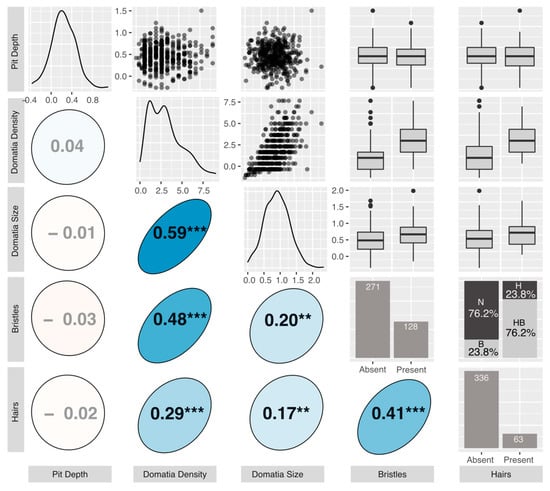 The graphical display of the correlation matrix for the measured phenotypes. All phenotypes displayed are accession means: Upper triangle: plotted relationships of the measured phenotypes. For box and whisker plots, the box represents the 25th and 75th percentiles, the bar represents the median, and dots are outliers beyond the quartiles. N = neither hairs nor bristles, B = bristles only, H = hairs only, HB = hairs and bristles. Lower triangle: Pearson’s correlation coefficients. Positive correlations are displayed in blue and negative correlations in red. Color intensity and the size of the circle are proportional to the correlation coefficients. Stars denote “holm” corrected p-values (*** < 0.001, ** < 0.01). Diagonal: density distributions of the phenotypes.