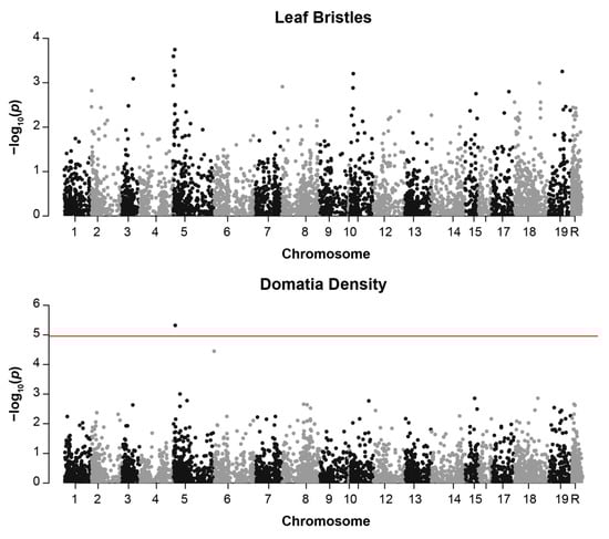Manhattan plots displaying genome-wide association results for: (top) bristle presence/absence and (bottom) domatia density. Plots are based on a MLM model with minor allele frequency of >1%. The red line indicates the Bonferroni-corrected threshold for significance with α = 0.05. SNPs on chromosome R are found on contigs that are not anchored to the reference genome.