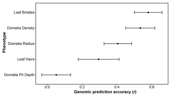 In cases where no significant SNPs were identified using GWAS, it is possible that the trait is controlled by numerous small effect loci throughout the genome. In such instances, genomic prediction can provide insight into the genetic architecture of the trait. Estimating the genomic prediction accuracy (r) across the five mite-recruitment phenotypes measured in this study resulted in values ranging from 0.05 for domatia pit depth to 0.58 for leaf bristles. The second highest accuracy was 0.53 for domatia density (Figure 5).