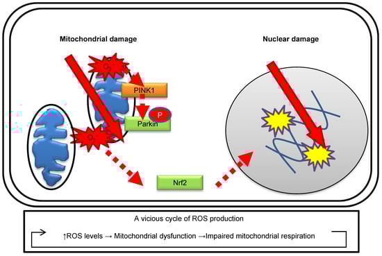 The role of mitochondria in the radiation response is well summarized in other mitochondrial biology papers [36]. The effects of ionizing radiation on the nuclei and mitochondria are illustrated in Figure 1. Radiation increases mitochondrial ROS levels according to the radiation dose and irradiation conditions in human fibroblasts [32]. Radiation-induced oxidative damage of mtDNA can be detected as increases in 8-hydroxydeoxyguanosine (8-OHdG) levels via high-performance liquid chromatography–electrochemical detectors (HPLC–ECD) [35]. Radiation activates mitochondrial biogenesis to aid in the increased energy demands for DDR [35,37]. As described above, mitochondria have a role in ROS generation during OXPHOS under irradiation. Radiation damage to the mitochondria leads to impairments in mitochondrial respiration and makes them more prone to ROS generation [36,38]. This leads to a vicious cycle of further ROS production and mitochondrial DNA damage. The selective removal of damaged mitochondria, known as mitophagy, is indispensable to cellular survival in cases where damaged mitochondria are releasing cytotoxic materials. In response to a loss of mitochondrial membrane potential, phosphatase and tensin homolog induced putative kinase 1 (PINK1), a mitochondrial kinase, phosphorylates Parkin, an E3-like ubiquitin-ligase, which, in turn, localizes specifically to impaired mitochondria [39]. Radiation-induced mitochondrial ROS are associated with the induction of mitophagy, which can be detected by the formation of Parkin and activation of the antioxidative response of nuclear factor erythroid 2-related factor 2 (Nrf2) in human fibroblasts [32,35]. Parkin can be utilized as a marker to identify oxidative damage in mitochondria.