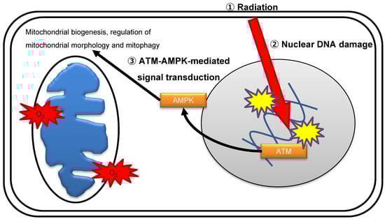 Radiation immediately stimulates multiple comprehensive molecular signaling pathways to execute DDR. ATM is considered the master sensor of DSBs and transduces the DNA damage signal to trigger the activity of downstream effectors by biochemical modification reactions [54]. The nuclear DNA damage signal diffuses to other intracellular organelles, including mitochondria, in irradiated cells. AMP-activated protein kinase (AMPK) protects cells against physiological stress by sensing energy stress when the ATP:AMP/ADP ratio declines and suppresses cell growth via regulating the mammalian target of rapamycin (mTOR) pathway [55]. AMPK controls various aspects of mitochondrial homeostasis by promoting mitochondrial biogenesis, regulation of mitochondrial morphology, and mitophagy [56]. One study suggests that ATM is an upstream kinase for the activation of AMPK by phosphorylation on Thr172 [57], while another study suggests that ATM does not directly phosphorylate AMPK [58]. The precise mechanism of ATM-mediated phosphorylation of AMPK after irradiation is under current investigation. ATM controls mitochondrial quality following radiation exposure [32,52,53]. AMPK acts as a mediator of DNA damage signals to mitochondria in response to genomic stress. DNA damage activates the ATM–AMPK–peroxisome proliferator-activated receptor γ coactivator 1α (PGC1α) signaling pathway, which facilitates mitochondrial biogenesis (Figure 2) [52,57]. ROS released from mitochondria cause indirect oxidative damage to nuclear DNA, which subsequently induces long-lasting oxidative damage, in irradiated cells. AMPK activates p53 and cyclin-dependent kinase inhibitors p21-dependent cell cycle arrest [59]. Collectively, ATM and AMPK are key molecules in the crosstalk between the nucleus and mitochondria under genomic stress conditions inflicted by ionizing radiation.