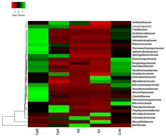 Relative abundance of dominant bacteria families in the maize rhizosphere samples under fertilization and unfertilized soil treatments. Cp8 (8 tons/ha compost manure), Cp4 (4 tons/ha compost manure), N2 (120 kg/ha inorganic fertilizer), N1 (60 kg/ha inorganic fertilizer), and Cn0 (control). The Z-score shows the level of abundance of the bacteria in the various soil samples. The green color represents the most abundant bacterial family, while the red color depicts less abundance within the samples.