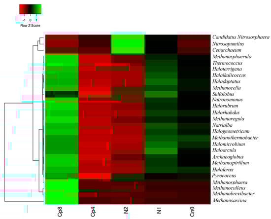 The archaeal community present in the soil have the highest abundance in Cp8 with the exception of Cenarchaeum, Candidatus Nitrososphaera, and Nitrosopumilus very abundant in N2 and Sulfolobus and Haloarcula, which were the most abundant archaea in N1. The control samples (Cn0) have only Methanothermobacter as the most abundant in the rhizosphere soils. The Cp4 treatment have few dominant archaea present in the rhizosphere soil of maize. Finally, there was a significant difference in the abundance levels of archaeal genus (p < 0.001) within the inorganic fertilizer, compost manure, and the control soil samples (Figure 3). The principal component analysis and the principal coordinate analysis for the archaeal genus are contained in Figures S3 and S4.