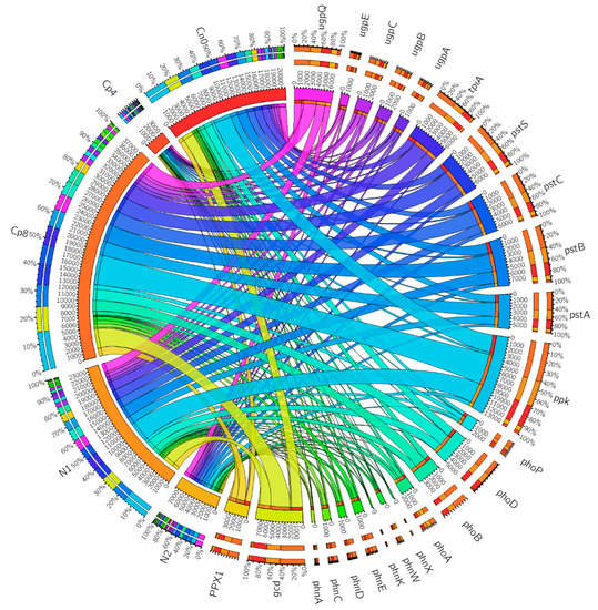 Phosphorous cycling genes relative abundance in the rhizosphere soil samples from maize plants under fertilization and unfertilized conditions as visualized by circus. Cp8 (8 tons/ha compost manure), Cp4 (4 tons/ha compost manure), N2 (120 kg/ha inorganic fertilizer), N1 (60 kg/ha inorganic fertilizer), and Cn0 (control). See Table S1.