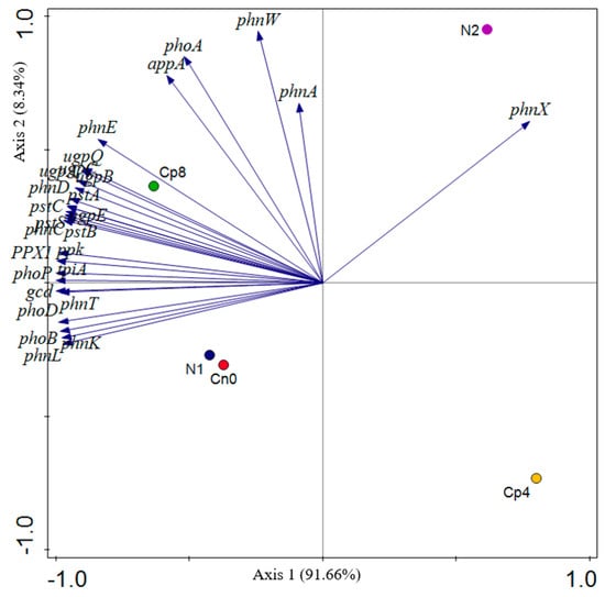The phnX, phnW, phoA, appA, and phnA genes (in Figure 5) are the major drivers to separate the N2 from the control and treated samples. The factors along the negative values of axis 1 distinguished the Cp8 from the N1 and Cn0 samples. Axis 1of the principal component analysis of the phosphorus cycling genes shows a strong positive loading for phnX (phosphonoacetaldehyde hydrolase) and strong negative loadings for pstC, pstB, ppk, phoD, gcd, pstA etc. The analysis of these genes reflects strong organic phosphate mineralization through the breakdown of carbon–phosphorus (C-P) bonds to yield phosphate ions and acetaldehyde by the enzyme phosphonoacetaldehyde hydrolase [61] in response to soil fertilization at positive axis 1 and increasing phosphate transport, polyphosphate formation, and mineralization of soil organic phosphorus at negative axis 1 [7,62,63]. At axis 2, there is a strong positive loading for alkaline phosphatase (phoA), 2-aminoethylphosphonate-pyruvate transaminase (phnW), and phosphonoacetate hydrolase (phnA). Alkaline phosphatase, a periplasmic enzyme with magnesium and zinc ions as cofactor is a thermostable and protease resistant enzyme [64] responsible for the uptake of inorganic phosphorus in a phosphorus limited environment [65,66]. The gene product of phnW is involved in bacterial mineralization of 2-aminoethylphosphonic acid through phosphonatase pathway. The substrate serves as a carbon, nitrogen, and phosphorus source for the microbes [67,68], whereas the phnA gene product (phosphonoacetate hydrolase) catalyzes the conversion of phosphonoacetate to acetate and phosphate ions through the cleavage of carbon–phosphorus bonds. The acetate produced serves as the sole carbon source for the microbes in the soil [69,70]. They are key enzymes that participate in phosphorus mineralization, solubilization, and uptake by microbes in the maize rhizosphere.