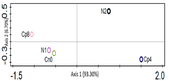 Principal coordinate analysis of the phosphorus cycling genes present at the rhizosphere of maize plants under fertilization and control treatments. Cp8 (8 tons/ha compost), Cp4 (4 tons/ha compost manure), N2 (120 kg/ha NPK), N1 (60 kg/ha NPK), and Cn0 (control).