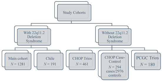 - Zhao, Y.; Diacou, A.; Johnston, H.R.; Musfee, F.I.; McDonald-McGinn, D.M.; McGinn, D.; Crowley, T.B.; Repetto, G.M.; Swillen, A.; Breckpot, J.; et al. Complete Sequence of the 22q11.2 Allele in 1,053 Subjects with 22q11.2 Deletion Syndrome Reveals Modifiers of Conotruncal Heart Defects. Am. J. Hum. Genet. 2020, 106, 26–40. [Google Scholar] [CrossRef] [PubMed]