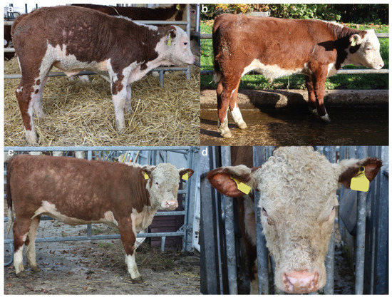 - Bracho, G.A.; Beeman, K.; Johnson, J.L.; Leipold, H.W. Further studies of congenital hypotrichosis in Hereford cattle. Zent. Vet. 1984, 31, 72–80. [Google Scholar] [CrossRef] [PubMed]