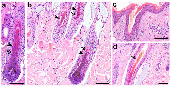 - Higgins, C.A.; Westgate, G.E.; Jahoda, C.A.B. Modulation in proteolytic activity is identified as a hallmark of exogen by transcriptional profiling of hair follicles. J. Investig. Dermatol. 2011, 131, 2349–2357. [Google Scholar] [CrossRef]