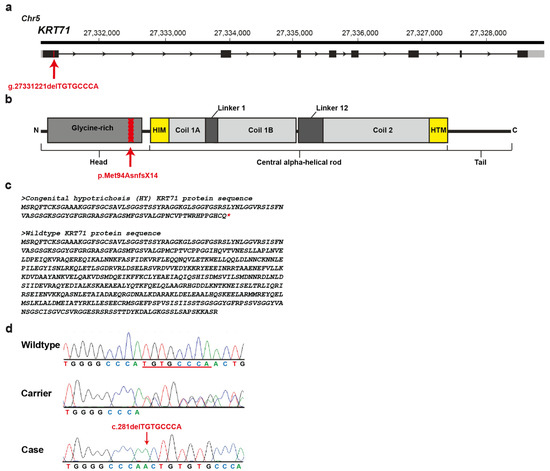 - Runkel, F.; Klaften, M.; Koch, K.; Böhnert, V.; Büssow, H.; Fuchs, H.; Franz, T.; De Angelis, M.H. Morphologic and molecular characterization of two novel Krt71 (Krt2-6g) mutations: Krt71rco12 and Krt71rco13. Mamm. Genome 2006, 17, 1172–1182. [Google Scholar] [CrossRef]