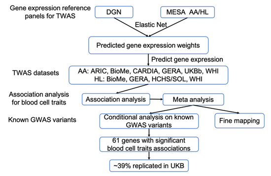 Along with the lack of diversity in included populations, GWAS of hematological traits, similar to other complex phenotypes, also identify regions of associated variants whose biological function and target genes are often not clear. One approach to linking variants to genes (and thus to biological function) that has demonstrated success in various complex traits is transcriptome-wide association studies (TWAS) [14,15]. TWAS methods leverage reference expression quantitative trait loci (eQTL) datasets to select genetic variants which in aggregate associate with to predict tissue-specific gene expression. Weights based on variant associations with a transcript are applied to cohorts with genotype (but not expression) data available [15,16]. Transcripts whose levels can be confidently imputed from genetic variants are then assessed for phenotype associations [17]. However, like GWAS, TWAS analyses have often included only EA populations [18,19], though some recent efforts have included more diverse populations [20,21,22,23,24]. Furthermore, most reference eQTL datasets used for TWAS include predominantly EA American individuals [25,26], limiting the predictive power of this novel method in other populations with different allele frequencies.