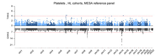 Mirror plot for the TWAS and GWAS results for platelets (PLT) in Multi-Ethnic Study of Atherosclerosis (MESA) Hispanic/Latino (HL). The upper panel shows TWAS marginal results and Table 1.