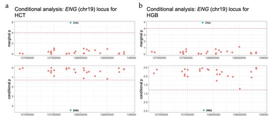 ENG locus. (a) The marginal and conditional results for ENG for hematocrit (HCT) and (b) hemoglobin (HGB) predicted using the Multi-Ethnic Study of Atherosclerosis (MESA) reference panel in African ancestry (AA) meta-analysis. The green dot denotes the gene ENG, the red dots denote other genes within this locus region.