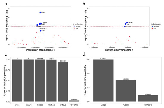 THBS3 locus. The THBS3 locus includes four genes: THBS3, EFNA2, TRIM46, and GBAP1. THBS3 was the most marginally significant gene, passing the Bonferroni threshold value (marginal p-value = 9.8 × 10−8) for HCT from TWAS analysis using the DGN reference panel in HL. The correlation of predicted gene expression was very low for these 4 genes (correlation R2 ranged from 7 × 10−4 to 0.03). However, the fine-mapping results included 6 genes: 4 significant genes (EFNA2, TRIM46, THBS3, and GBAP1) plus 2 additional non-significant genes (MTX1 and KRTCAP2), in the 95% credible set (Figure 8a,c). MTX1 is reported as the mapped gene for the previously reported GWAS lead variant for HCT at this locus (i.e., rs760077) [9,11,38]. However, MTX1 was not significant in our TWAS results, despite adequate model R2 for gene expression prediction (marginal p = 0.001; model R2 = 0.10). Within this locus the predicted gene expression between the lead gene THBS3 and GWAS-reported gene MTX1 was not correlated (R2 = 7.2 × 10−5), but the gene prediction correlations are stronger between MTX1 and GBAP1 (R2 = 0.31), MTX1 and EFNA3 (R2 = 0.40), and MTX1 and TRIM46 (R2 = 0.78). We further note that FINEMAP assigned MTX1 the highest marginal posterior inclusion probability (PIP = 1) [9,44], followed by GBAP1. Given the high correlations between GBAP1, EFNA3, TRIM46, and MTX1, none of which are correlated with lead TWAS gene (THBS3), it is difficult to accurately narrow down a reasonably sized candidate causal gene set at this locus. The low PIP for the most significant THBS3 gene is also difficult to interpret. In summary, fine-mapping was not informative in pinpointing the candidate causal gene for this locus.