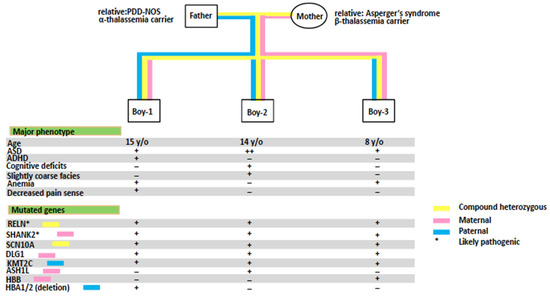 The participating family for this study has three boys with ASD, born to phenotypically normal, non-consanguineous parents. The mother is a β-thalassemia carrier. The mother’s paternal aunt and uncle both exhibit symptoms of obsessive-compulsive disorder (OCD) and anxiety disorder (unconfirmed). The mother’s father is anemic and is strongly suspected to have high-functioning ASD. The father is an α-thalassemia carrier, and the father’s nephew has Pervasive Developmental Disorder—Not Otherwise Specified (PDD-NOS). All of the boys were diagnosed with ASD using gold-standard Autism Diagnostic Observation Schedule—Generic (ADOS-G) and Autism Diagnostic Interview—Revised (ADI-R) psychometric measures. Sib-1 (15 years old) has Attention Deficit Hyperactivity Disorder (ADHD), anemia, decreased pain sensitivity, and no outwardly syndromic features. Sib-2 (14 years old) has slightly coarse facies. He shows the most prominent cognitive deficits and a greater severity of ASD. He has a history of dysphagia and no anemia (not a thalassemia carrier). Sib-3 (8 years old) has suspected IUGR, anemia since birth, astigmatism, and dysphagia with problematic swallowing. None of the affected siblings show any outwardly syndromic or dysmorphic features.